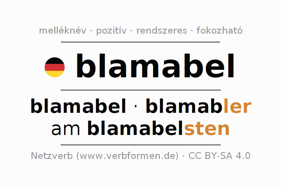 blamabel melléknév ragozása (szégyenteljes) a fokozás formáit használja blamabel,blamabler,am blamabelsten. A középfok és felsőfok képzői er/sten. A(z) blamabel melléknév használható jelzőként főnév előtt, illetve állítmányként igével együtt.Itt nemcsak a(z) blamabel ragozható és fokozható, hanem minden német melléknév is. Hozzászólások ☆